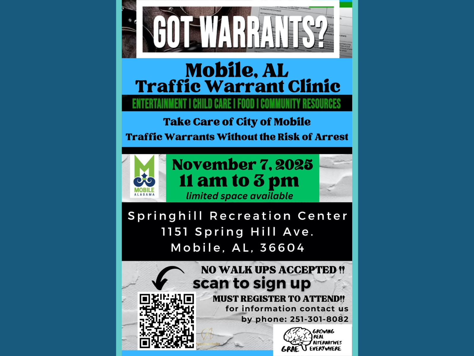 Previous Warrant Clinics in Mobile have been incredibly successful, benefiting citizens and helping quickly resolve traffic-related cases. Those with traffic-related warrants pending in Mobile Municipal Court can sign up for the Nov. 7 clinic at https://link.edgepilot.com/s/e061234c/A7EKdNzI2ku6f9F_WgtByQ?u=https://form.jotform.com/250077211182043.