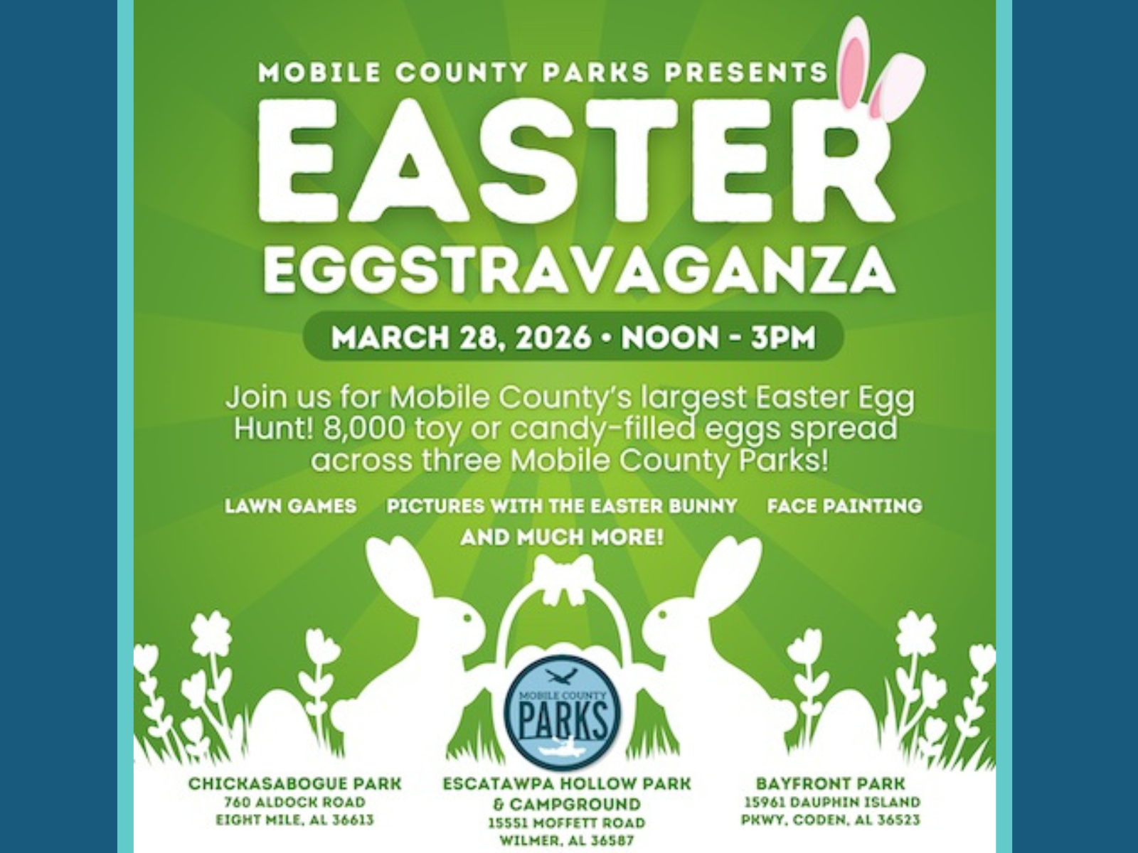 MOBILE COUNTY, Ala. — Mobile County will host its annual Easter Eggstravaganza on Saturday, March 28, 2026, from noon to 3 p.m., featuring 8,000 toy- or candy-filled eggs spread across three local parks.