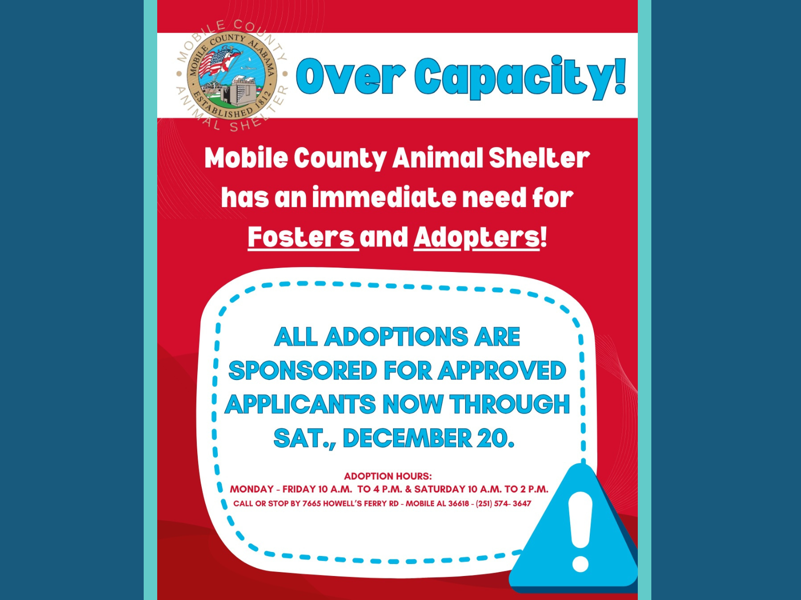 | WHAT? | The Mobile County Animal Shelter is currently over capacity and has no available space. With more than 100 dogs currently available for adoption and many more on stray hold, we urgently need our community to step up and foster or adopt! All adoption fees have been sponsored for approved applicants, now through Saturday, Dec. 20. |