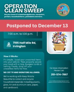 WHAT? Mobile County’s final Operation Clean Sweep of 2025, scheduled for Dec. 6, has been postponed to Dec. 13.