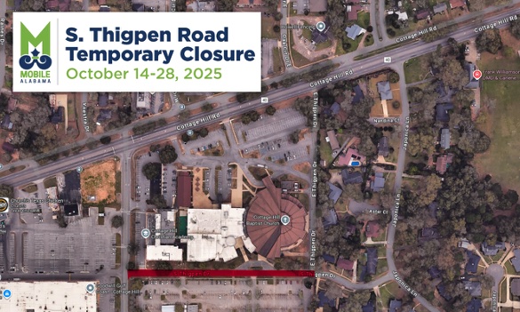 Mobile, Ala. — The City of Mobile will temporarily close S. Thigpen Drive between Demetropolis Road and E. Thigpen Drive beginning Tuesday, October 14, as part of an ongoing traffic study.